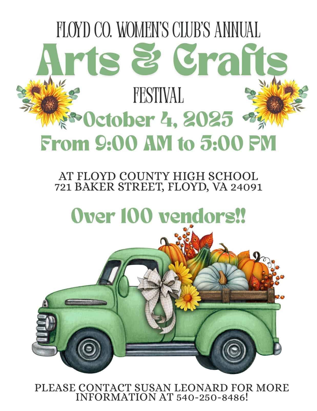 « All Events This event has passed. Annual Arts & Crafts Festival October 4 : 9:00 am - 5:00 pm « Yard Sale Fundraiser Jivamukti Yoga with Mary Brown » Add to calendar Google Calendar iCalendar Outlook 365 Outlook Live Details Date: October 4 Time: 9:00 am - 5:00 pm Venue Floyd County High School 721 Baker Street Floyd, VA 24091 United States + Google Map Phone 5402393854