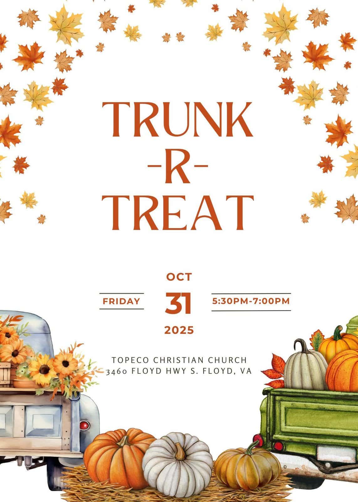 « All Events This event has passed. Halloween Trunk or Treating @ Topeco Christian Church October 31 : 5:30 pm - 7:00 pm « Treats and Hot Cider @ Sojourn Church of Floyd Trick or Treat @ Skyline Nursing and Rehabilitation » Add to calendar Google Calendar iCalendar Outlook 365 Outlook Live Details Date: October 31 Time: 5:30 pm - 7:00 pm Venue Topeco Christian Church 3460 Floyd Hwy S Floyd, VA 24091 + Google Map