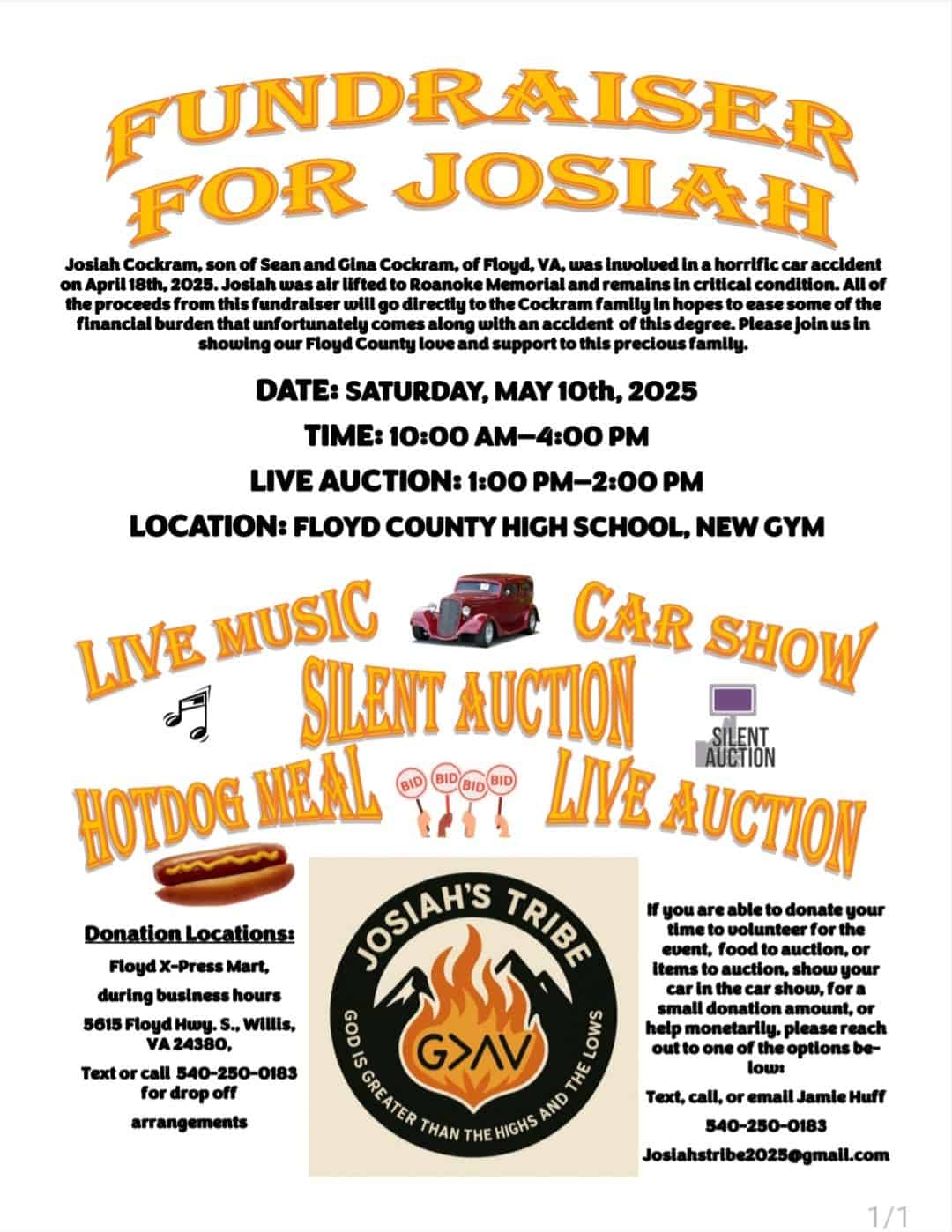 « All Events This event has passed. Josiah Cockram Fundraiser May 10 : 10:00 am - 4:00 pm « Citizens Community Yard Sale Americana Afternoon » Add to calendar Google Calendar iCalendar Outlook 365 Outlook Live Details Date: May 10 Time: 10:00 am - 4:00 pm Venue Floyd County High School 721 Baker Street Floyd, VA 24091 United States + Google Map Phone 5402393854