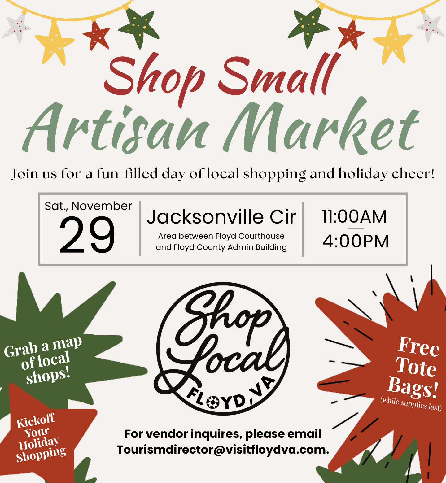 Join us for the Shop Small Artisan Market on Small Business Saturday and celebrate Floyd’s local makers, artisans, and small businesses!