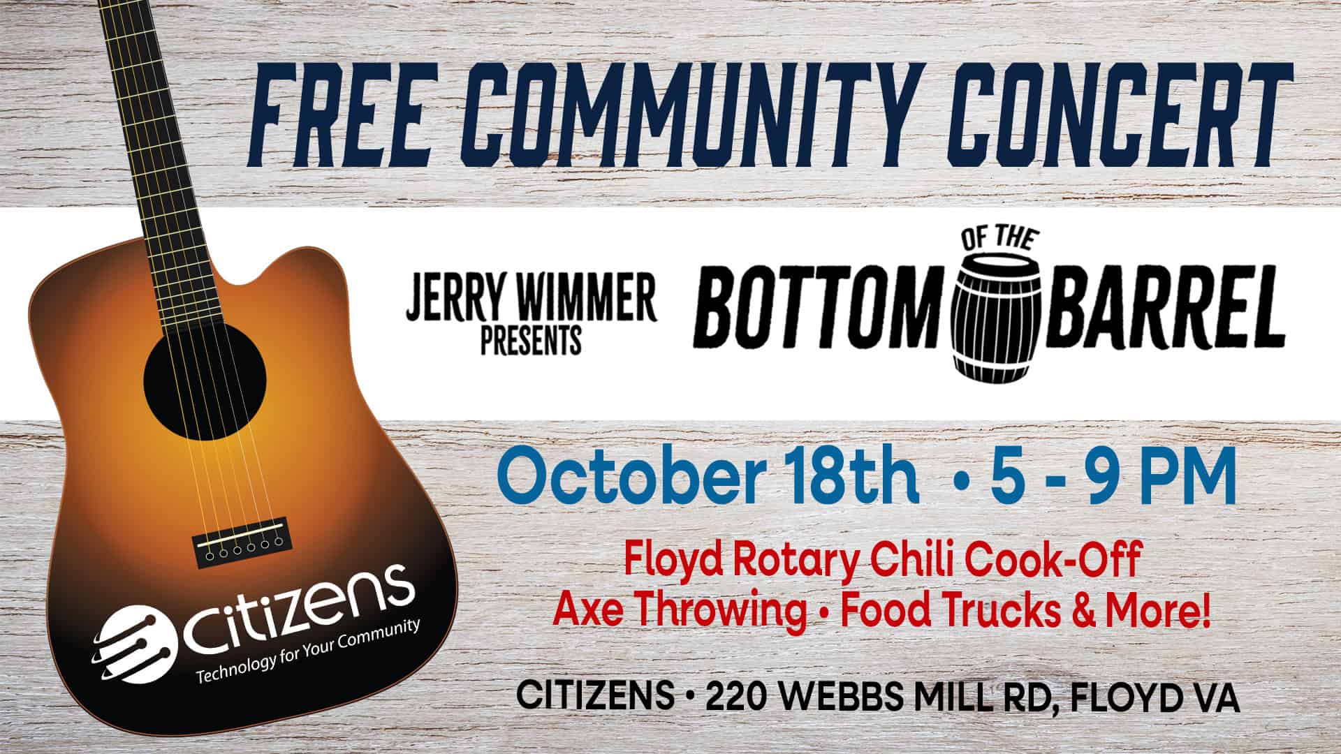 Citizens is holding a FREE Community Concert on October 18th from 5-9 pm in our vehicle shelter.... More